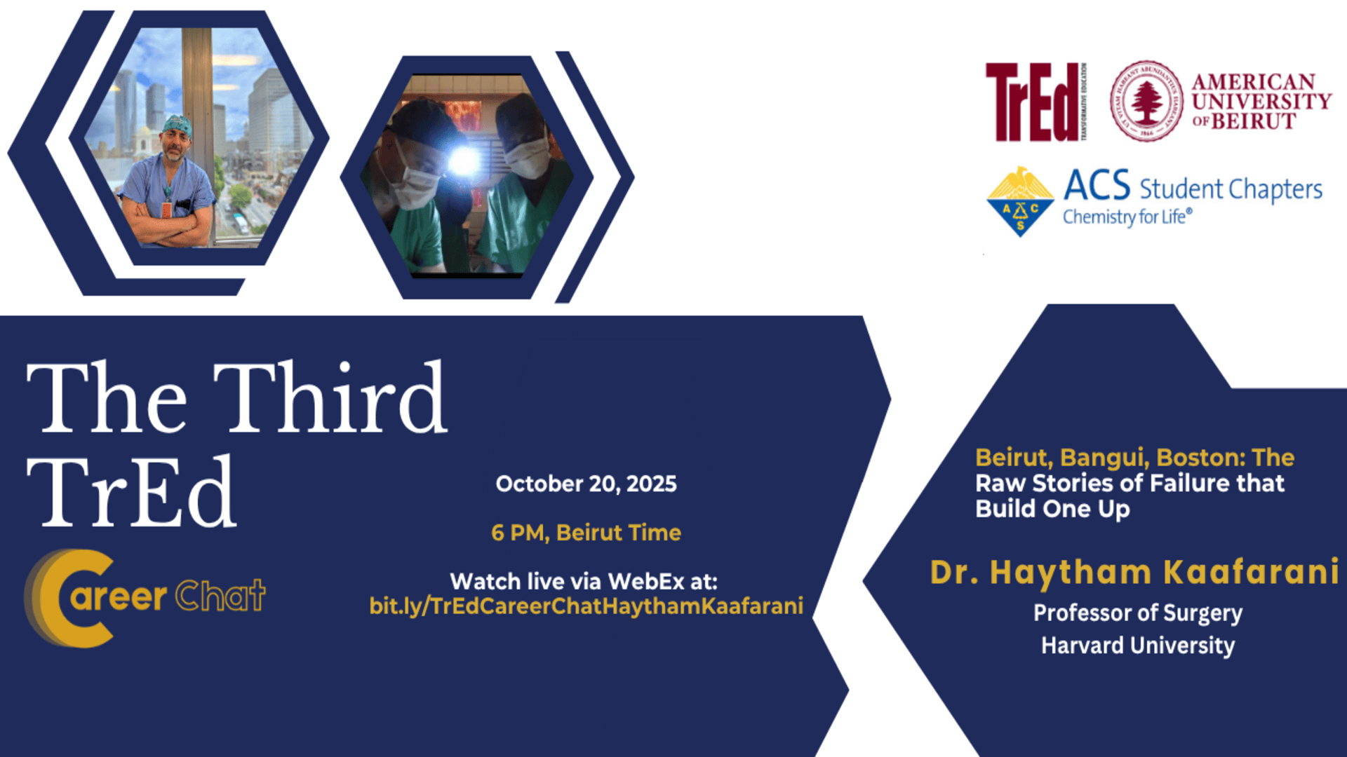 Dr. Haytham Kaafarani, Professor of Surgery at Harvard Medical School, delivered the third TrEd Career Chat, entitled, “Beirut, Bangui, Boston: The Raw Stories of Failure That Build One Up" on Oct 20, 2025. From Beirut to Boston, Dr. Haytham redefined the meaning of success. He reminded us that failure is not the opposite of success; it is the foundation of achievement. He did not speak of titles or triumphs, but of moments that revealed what true leadership means, showing that medicine's greatest power is human connection. He reminded us that failure is fuel, vulnerability is strength, and that the greatest investment any leader can make is in people.
