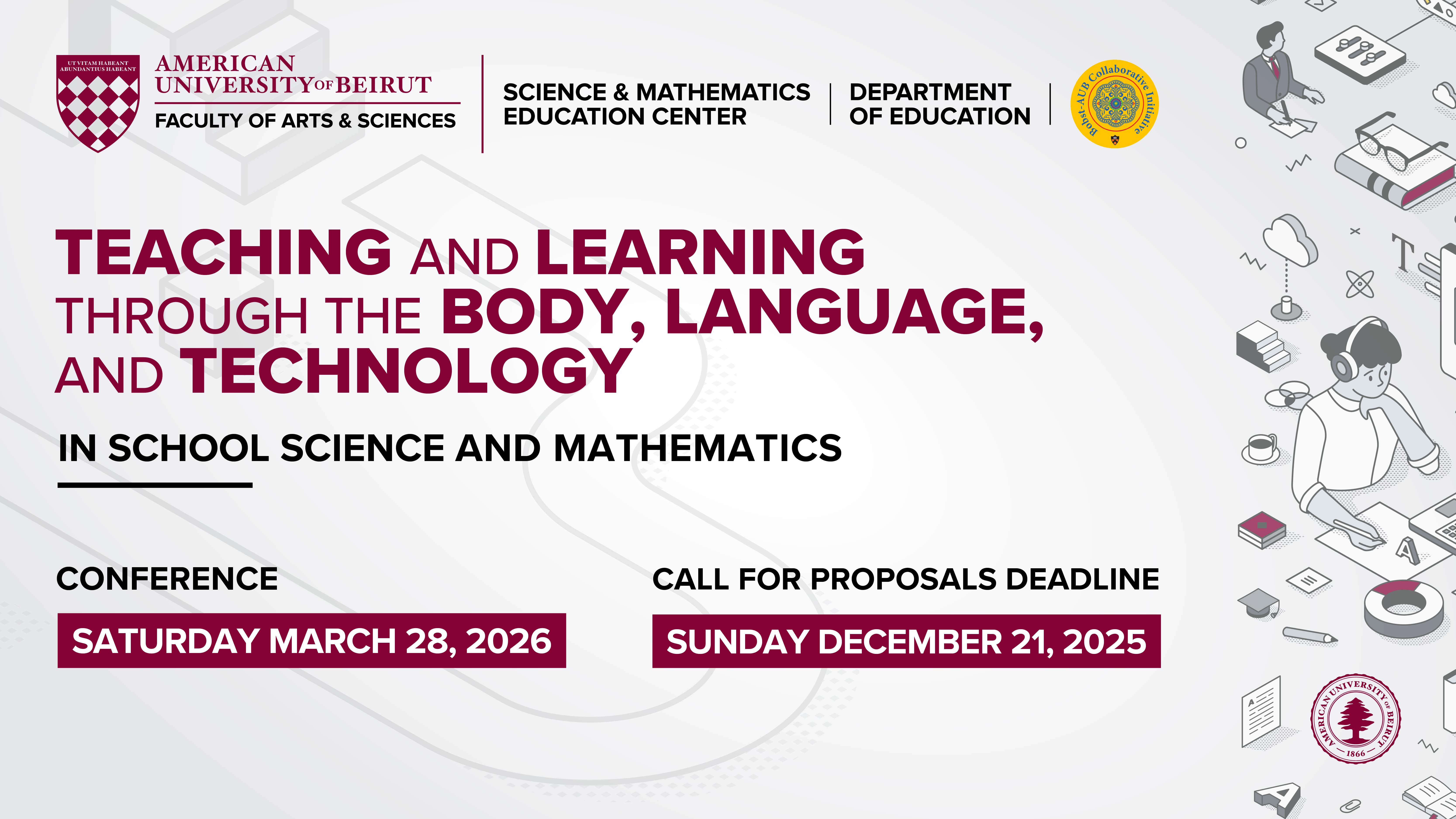 The Science and Mathematics Education Center within the Department of Education at the American University of Beirut will hold its Twenty-Seventh Annual Science and Math Educators Conference (SMEC 27) on campus on March 28, 2026. This year's conference theme is “Teaching and Learning Through the Body, Language, and Technology in School Science and Mathematics."
